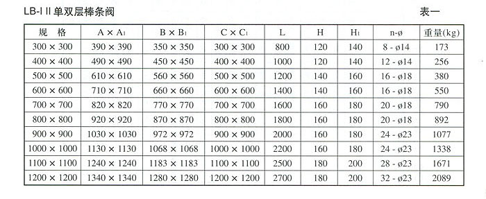 五、主要外形及連接尺寸:(見圖、表) 圖一 LB-I II單雙層棒條閥