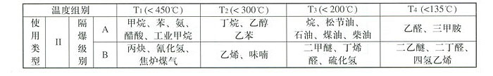 四、爆炸性氣體混合物舉例表與防爆炸級別、溫度組別選用關系: